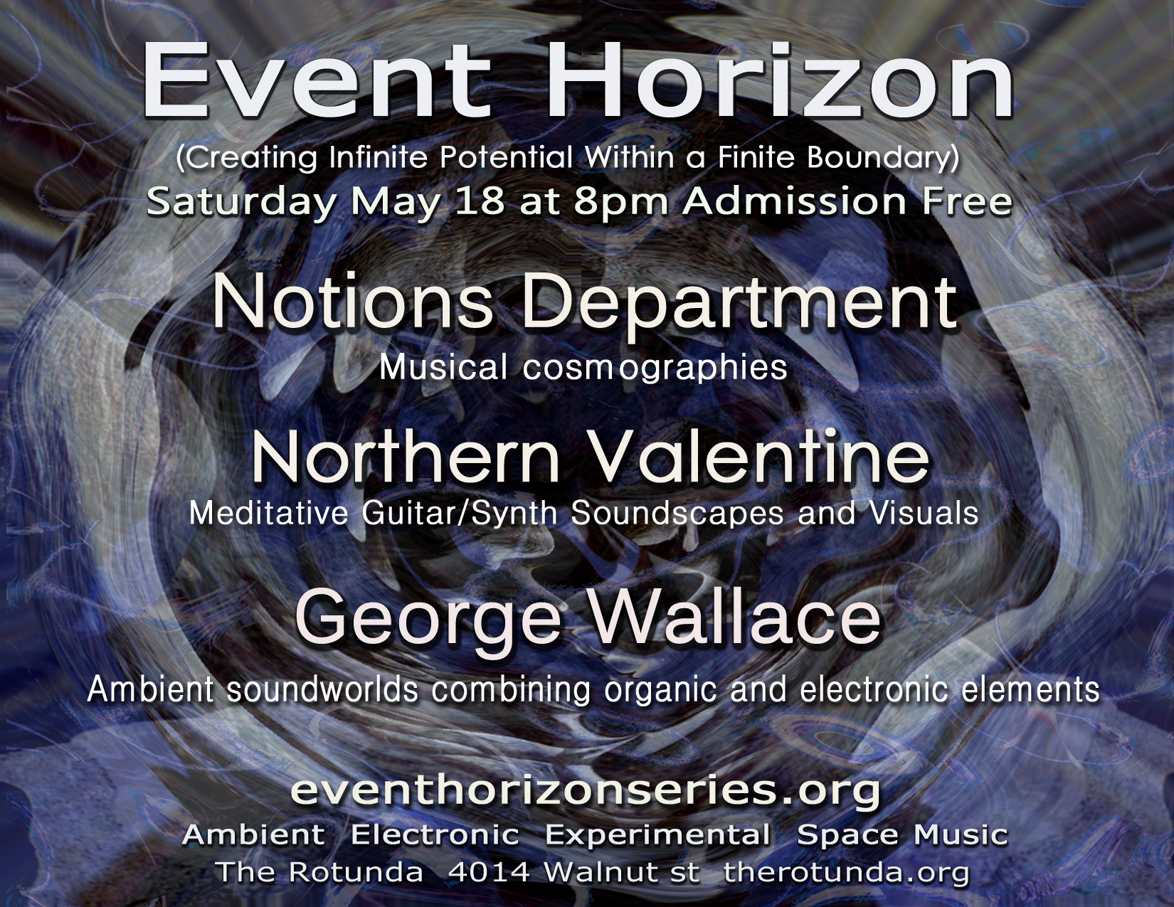 Event Horizon Series presents Notions Department (musical cosmographies) Northern Valentine (meditative guitar/synth soundscapes and visuals) George Wallace (ambient sound worlds combining organic and electronic elements