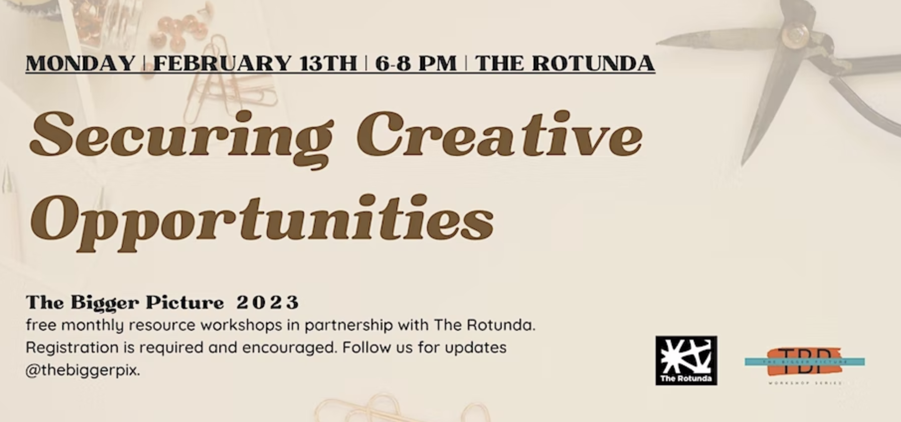 This workshop is FREE and in-person. Registration is required. Please register at https://www.eventbrite.com/e/securing-creative-opportunities-tickets-493380433157