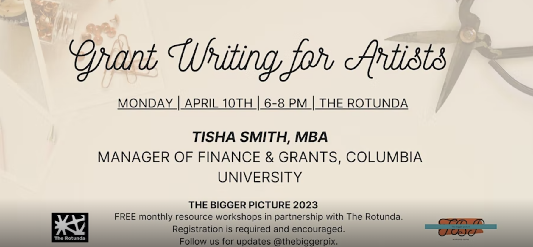 The Bigger Picture (TBP), in partnership with The Rotunda, local artists and creative entrepreneurs, offers free resources workshops for artists and organizations on a monthly basis.