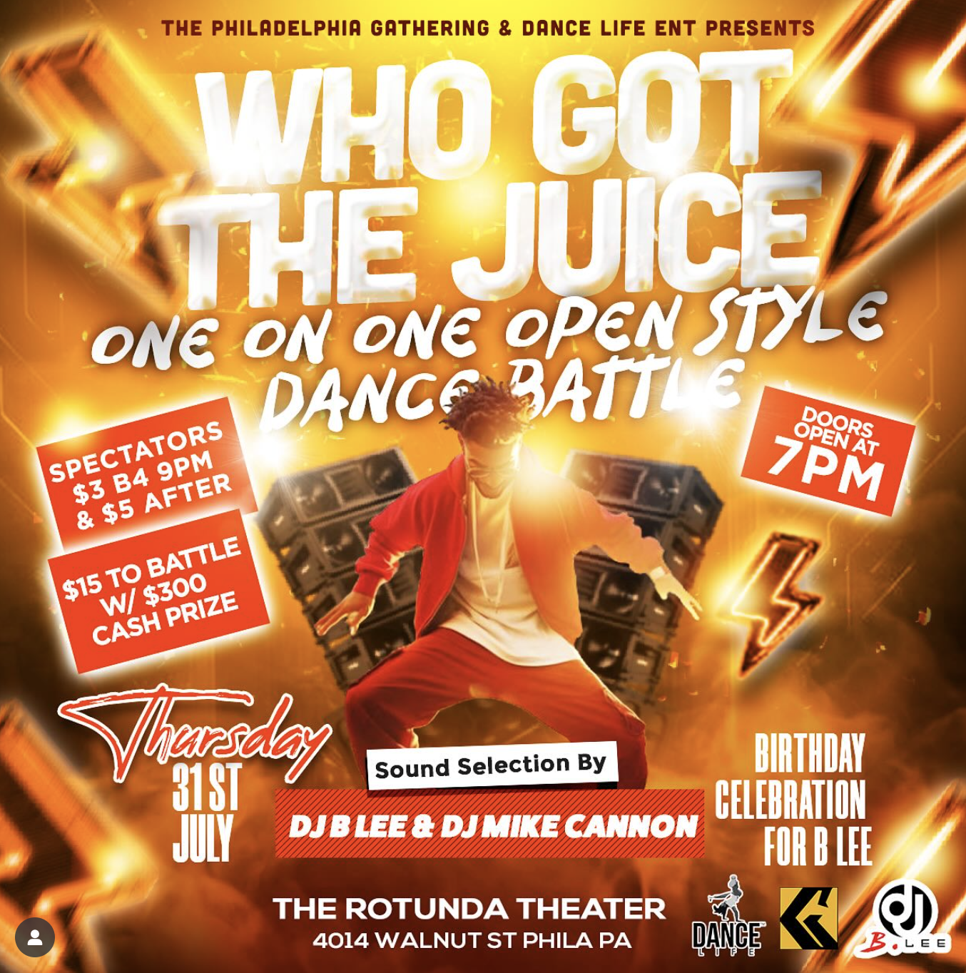 Doors at 7pm. @thegathering215 will host Who Got the Juice 1 v 1 open style dance battle. Sound selection by DJ B Lee and DJ Mike Cannon Spectators $3 before 9pm, $5 after. $15 to battle. $300 cash prize.
