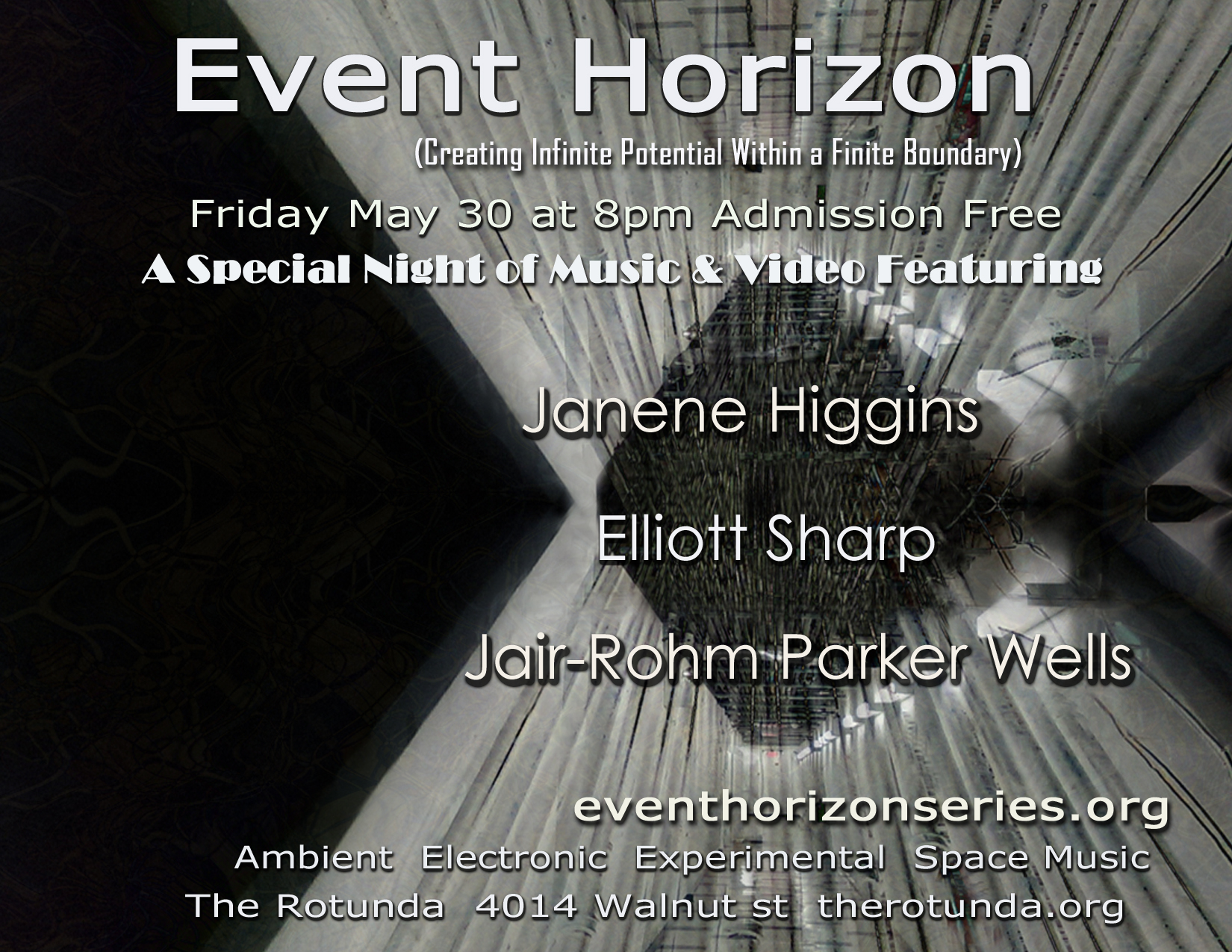 The Event Horizon concert series takes place at The Rotunda, on the University of Pennsylvania campus. It features Electronic, Avant Garde, and Experimental music along with the work of live video, laser and analog projection artists. The concerts are always free and open to all.
