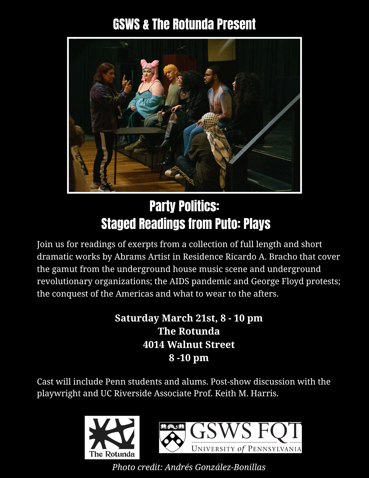 Join us for readings of excerpts from a collection of full length and short dramatic works by Abrams Artist in Residence Ricardo A. Bracho that cover the gamut from the underground house music scene and underground revolutionary organizations; the AIDS pandemic and George Floyd protests; the conquest of the Americas and what to wear to the afters. Cast will include Penn students and alums. Post-show discussion with the playwright and UC Riverside Associate Prof. Keith M. Harris.