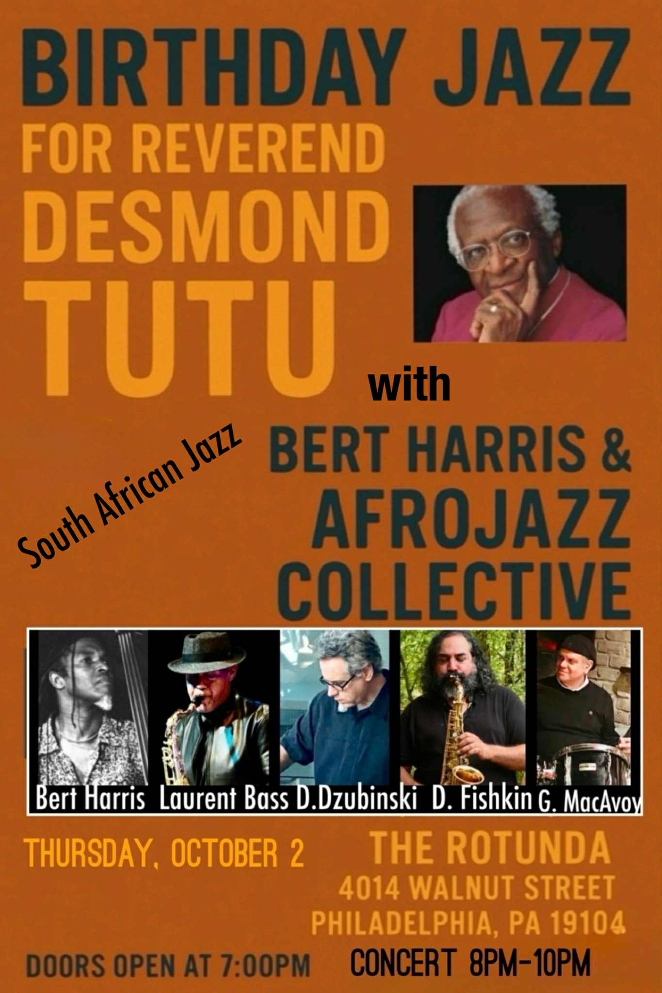 Bassist Bert Harris leads this ensemble of jazz and world music musicians playing original compositions, American and South African jazz, Reggae, New Orleans jazz and Ska. For this concert The Afrojazz Collective will play primarily tunes by South African Jazz composers, who through their music and activism helped to dismantle the South African Governments System of apartheid. This concert is a birthday tribute for South African Anglican bishop and theologian, Reverend Desmond Tutu, known for his aniti-apartheid and human rights activism. (October 7. 1931---December 26, 2012) Free/donations appreciated.