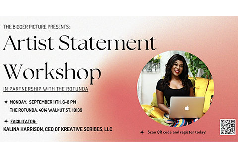 Join us for the Artist Statement Workshop on September 11, 2023, from 6:00 PM to 8:00 PM. This exciting event will be hosted by Jasmine Jahwula Seapoe, with Kalina Harrison as your workshop facilitator.