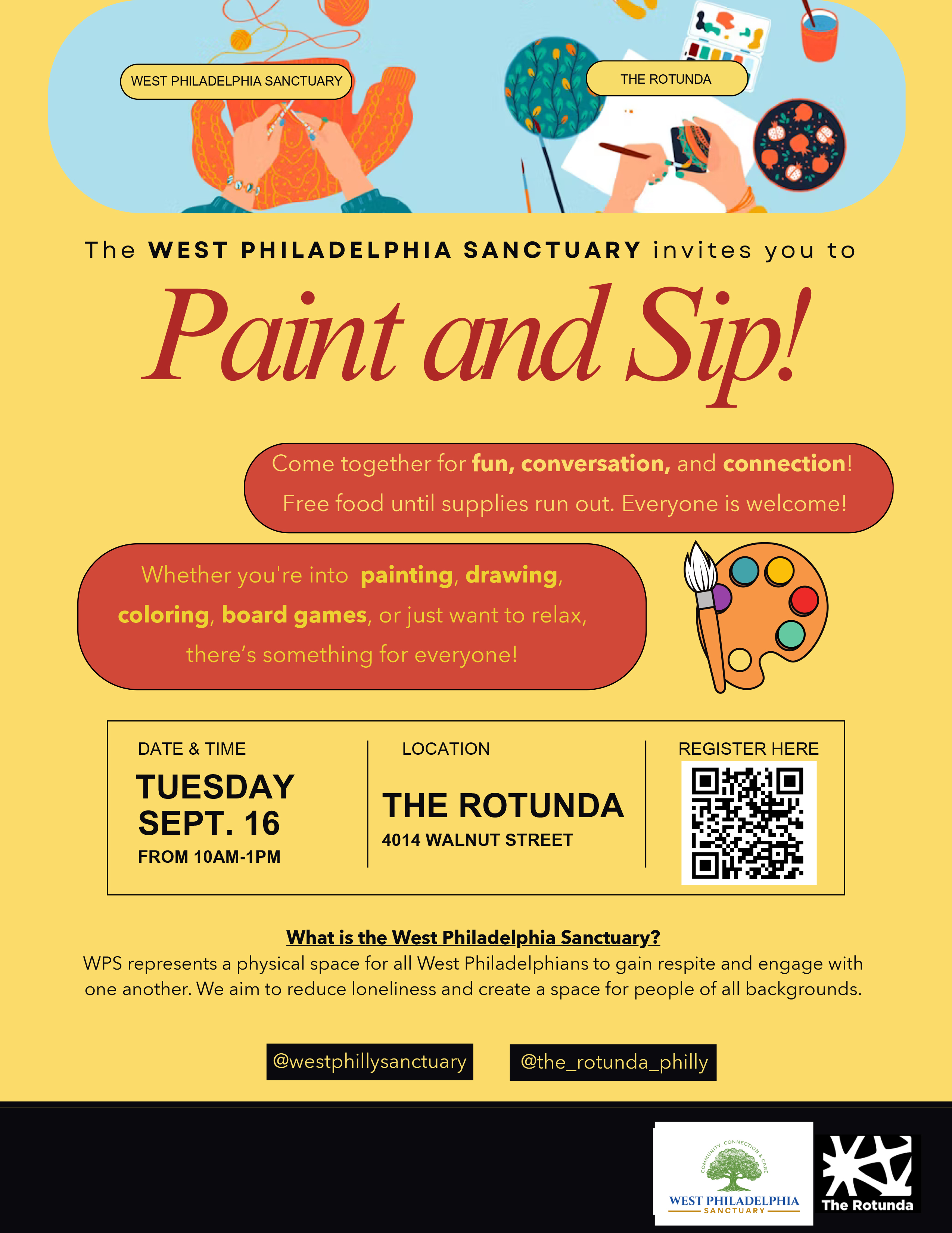 The West Philadelphia Sanctuary invites you to Paint & Sip! Enjoy drawing, painting, coloring, board games, good conversation, and refreshing non-alcoholic drinks!